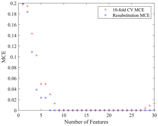 In order to avoid information redundancy caused by the correlation between features, this study used the wrapper approach for feature selection based on the MCE of QDA. The wrapper feature selection approach is widely used and has been proven to have good performance [82,83,84]. The training set is used to select the features and fit the QDA model, with the test set used to evaluate the final performance. Subsets of features were obtained by forward sequential feature selection, with 10-fold cross-validation applied to the training set to evaluate the performance of each candidate feature subset. The algorithm stops when the first local minimum of the cross-validation MCE is found.