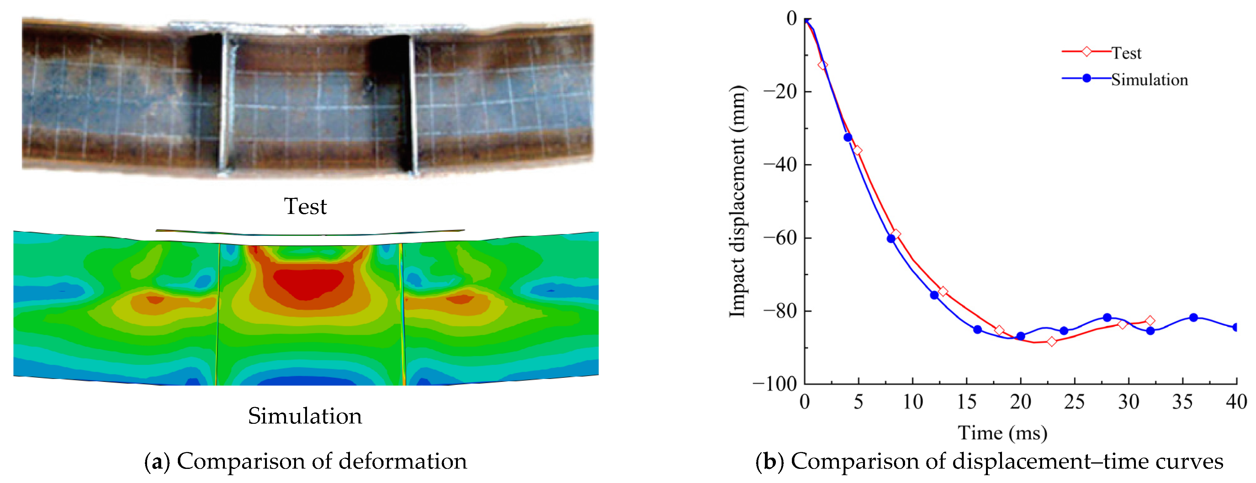 - In order to further extend the existing research results, it is necessary to conduct a parametric study of space steel frames to investigate the impact dynamic response and structural resistance to continuous collapse under different structural arrangements. The contribution of the floor slab is not considered in this paper, and it is necessary to study the effect of the floor slab of the building structure under impact loads for future research on continuous collapse resistance. Meanwhile, this paper verifies the validity of the numerical model by comparing it with the existing scaled-down tests. However, the simplified and scaled-down steel beam impact tests cannot adequately reflect the impact resistance of actual frame structures. Future research should actively carry out full-scale impact tests of frame structures to obtain more accurate data for numerical validation or practical engineering applications.