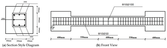 The test (scale model) was conducted using an RC square column in the frame structure of civil buildings as the prototype. The parameter design of the square column strictly followed Chinese Code for Design of Concrete Structures GB 50010-2010 [26] and Technical Specification for Concrete Structures of Tall Buildings JGJ 3-2010 [27].