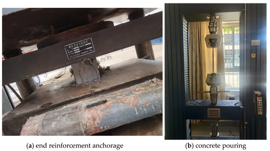 The material performance test is shown in Figure 3. The experiment utilized two grades of steel reinforcement, HRB400 and HRB335. To measure their mechanical properties, six specimens were randomly sampled and tested using the UTC100kN microcomputer-controlled electro-hydraulic servo universal testing machine (manufactured by Shenzhen Regel Instrument Co., Ltd., Ningbo, China) at the School of Civil Engineering, Ningbo University. The measured mechanical properties are shown in Table 1.