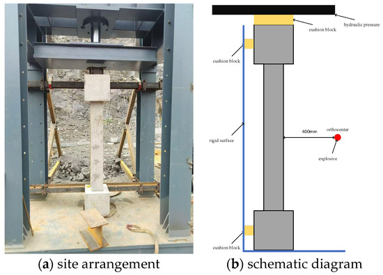 The test was conducted on site, with the RC column secured in a hydraulic press during the experiment, as shown in Figure 4a. The column was restrained using a completely fixed boundary condition, and the explosive charges were suspended at a specified height in front of the specimen, as illustrated in Figure 4b. The explosive used was a commercial emulsion explosive, triggered by an electric detonator.