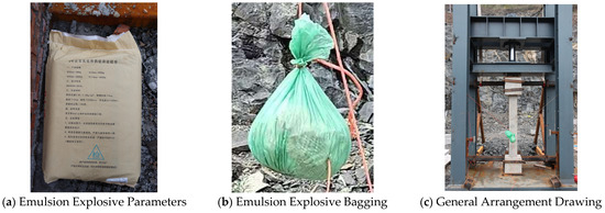 Figure 6a shows the material parameters of the explosive charge. Two overpressure sensors were positioned at 80 cm and 90 cm from the explosion center on both sides, respectively. The spherical explosive charge was centrally initiated using a detonator. The charge equivalent in the subsequent proportional distance of the emulsion explosive was multiplied by the coefficient of 0.7 [29,30]. The masses of the charges, determined by weighing, were 1 kg, 4 kg, and 6 kg, respectively. The 6 kg charge configuration is shown in Figure 6b. The experimental procedure was conducted as follows: First, the RC column was hoisted and securely fixed. Pressure sensors and displacement sensors were subsequently installed and connected to the data acquisition system. A multimeter was employed to perform continuity testing on sensor signal transmission channels to verify operational integrity. Following system calibration, emulsified explosives were suspended via a cord at the predetermined blast height in front of the specimen. Detonators were then installed and connected to the explosive charge. After confirming initiation circuit continuity, the AC initiation power supply was engaged. All monitoring systems were maintained in pre-trigger standby mode until remote detonation was executed. The specific experimental setup configuration is illustrated in Figure 6c.
