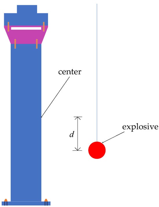 The purpose of the blast test was to investigate the effects of the axial compression ratio and detonation location d on the dynamic response and damage characteristics of RC columns under blast loading. The definition of d is shown in Figure 7. The experimental design is summarized in Table 3. Each test case was labeled using a combination of the definition of d, scaled distance (Z), and the column’s axial compression ratio. The axial compression ratio was calculated using the following formula:
