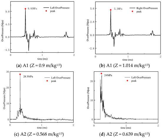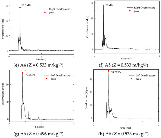 Figure 8 shows the reflected Reflected overpressure time histories of the blast loading. It can be observed that when the shock wave reaches the pressure transducers, the pressure rapidly increases, followed by an exponential decay of overpressure with time. Additionally, the 1 kg charge exhibits two distinct overpressure phases, attributed to a secondary detonation of the emulsion explosive [31]. The overpressure demonstrates a sharp peak surge with increasing scaled distance (Z = R/W1/3, where R is standoff distance and W is charge mass), which may be induced by the detonation products of the emulsion explosive. The validity of the data is cross-verified through the right-side overpressure measurements in scenarios A4, A5, and A6.