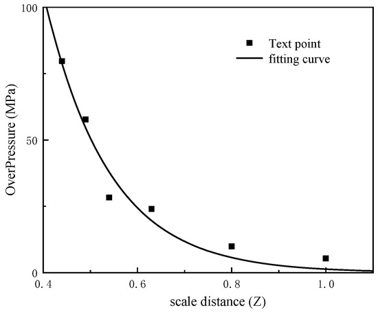 The observed exponential growth of overpressure with increasing scaled distance motivates this study to establish the relationship between overpressure and scaled distance through curve fitting, as illustrated in the accompanying Figure 9. This paper further proposes an empirical formula (Formula (2)) to offer practical guidance for engineering applications.