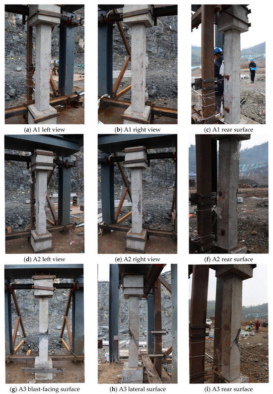 The damage of the RC column after the explosion is shown in Figure 10. In Test A1, due to the relatively small explosive equivalent used, minor concrete spalling occurred on both sides of the RC column, while no central blast crater formed, as shown in Figure 10a–c. The overall structural integrity of the column remained intact, with no through-cracks or other forms of damage. This indicates that lower explosive equivalents induce limited destructive effects on RC columns.