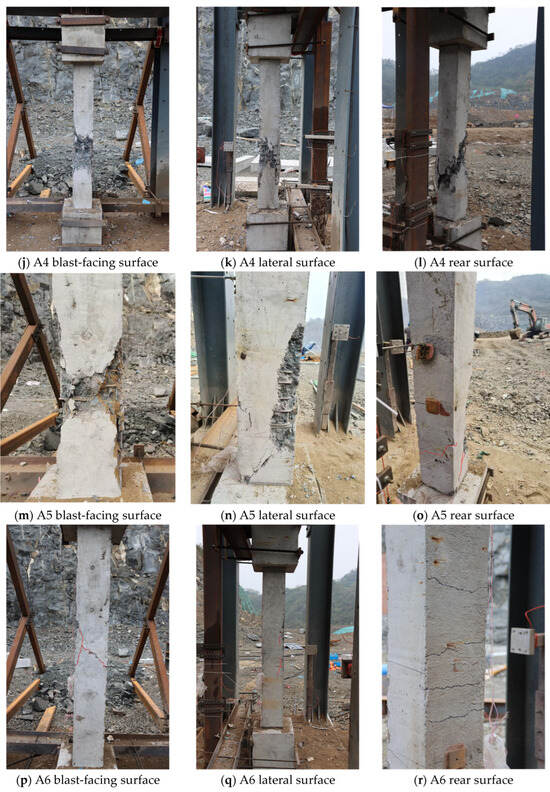 In Test A6, with a centrally positioned 6 kg charge, minimal damage was observed (Figure 10p–r): only minor bilateral concrete spalling occurred, without through-cracking, confirming that eccentric blast loading predominantly drives mechanisms in RC columns.