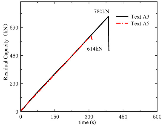By comparing Tests A1, A2, and A3, it can be observed that structural damage increases with the growth in the charge equivalent. Specifically, comparing A1 with A2 and A2 with A3 reveals that this increase is not linear but follows an exponential trend. Notably, Test A4 exhibits the most severe damage, characterized by penetrating diagonal cracks in the structure. This outcome stems from the extreme test conditions involving a large scaled distance, high axial compression, and eccentric explosion. In contrast, when comparing Test A3 with A4 under halved axial compression, both the number and size of visually observable diagonal cracks are significantly reduced. Tests A3, A5, and A6 illustrate the influence of explosive positioning on structural damage. While the structural integrity of A6 appears relatively preserved, the external differences in damage between A5 and A6 are subtle. Consequently, residual load-bearing capacity tests were conducted for Tests A5 and A6. As shown in Figure 11, the residual load-bearing capacity of the reinforced concrete column decreases when the explosion occurs closer to the column base. This phenomenon occurs because proximity to the column base increases susceptibility to shear failure.