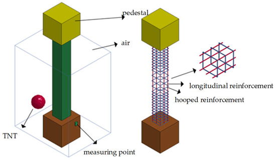 TNT and the surrounding air medium were discretized using Eulerian mesh, while solid structures such as RC columns were modeled with Lagrangian mesh. The fluid–structure interaction between blast shockwaves and structures was achieved using the fully coupled Eulerian–Lagrangian contact algorithm provided by LS-DYNA.