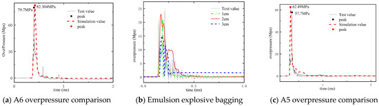 Three mesh sizes (1 cm, 2 cm, and 3 cm) were investigated for grid discretization schemes. This mesh size is also consistent with previous studies [36,37,38]. Using experimental Case 2 for analysis, Figure 13b presents the computational results under different mesh densities. The 1 cm and 2 cm meshes demonstrated minimal discrepancies in blast loading compared with experimental measurements, while the 3 cm mesh exhibited a significant deviation of 32.9% in pressure peak value. The relative errors for 1 cm and 2 cm meshes were 0.89% and 0.96%, respectively. Although finer meshes (e.g., 1 cm) provide more accurate pressure peak predictions, post-peak pressure variations became negligible regardless of mesh refinement. Therefore, considering the optimal balance between computational accuracy and resource expenditure, the 2 cm mesh configuration was selected for subsequent finite element analyses. At the same time, in order to prove the reliability of the simulation, it is compared with the experimental overpressure data, as shown in Figure 13.