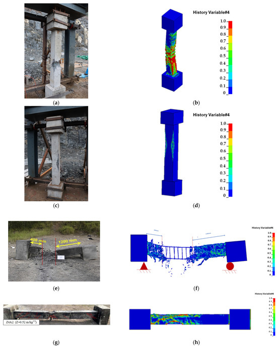 Simulation Damage verification. (a) A2 Test; (b) A2 Simulation; (c) A3 Test; (d) A3 Simulation; (e) Wu [4] Test; (f) Simulation; (g) Shi [12] Test; (h) Simulation.