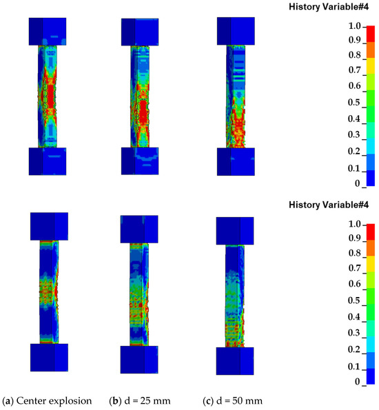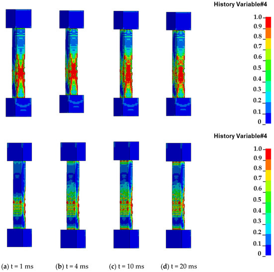 To validate the applicability and effectiveness of the finite element model proposed earlier, the aforementioned model was employed to simulate the dynamic response and damage patterns of the half-scale RC columns described in Section 2 and the RC columns tested by Shi [9] under blast loading. The numerical simulation results were then compared with experimental findings. This section specifically focuses on analyzing the dynamic behavior and failure modes of the test columns from this study, Shi’s [12] experiment, and Wu’s [4] experiment under field blast loads through simulation and comparative analysis. Figure 14a–d present comparative damage diagrams for Conditions A2 and A3 from the experimental study in this paper. Figure 14e–h, respectively, show simulated damage comparisons for Wu’s [4] and Shi’s [12] tests, which demonstrate typical failure modes including diagonal shear failure, surface spalling, collapse, and flexural failure. This study used equivalent plastic strain as the strain criterion for the simulation. In the RHT constitutive model, the option is displayed as history variable #4.