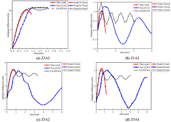 Figure 19c shows the horizontal displacement–time history curves of the middle point of the RC column under the same explosion load when the proportional distance is 0.48 m/kg1/3, 0.5 m/kg1/3, 0.55 m/kg1/3, and 0.6 m/kg1/3, respectively. The experimental results depicted in the figure demonstrate an inverse correlation between the proportional distance parameter and the maximum horizontal displacement at the column’s midspan.