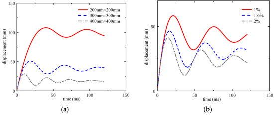 Figure 19a gives the horizontal displacement–time history of the midpoint of the RC column under the same explosive load when the section sizes are 200 mm × 200 mm, 300 mm × 300 mm, and 400 mm × 400 mm, respectively. It can be observed from the diagram that as the section size of the RC column increases, the maximum horizontal displacement and residual displacement at the column’s midpoint are significantly reduced. This result aligns with physical expectations, as increasing the cross-sectional size enhances the column’s bending and shear stiffness, thereby reducing the maximum horizontal displacement during loading.