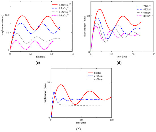 Displacement–time history. (a) Displacement–time history of different section sizes. (b) Displacement–time history of columns with different reinforcement ratios. (c) Displacement–time history of columns with different scale distances. (d) Displacement–time history of different axial compression columns. (e) Displacement–time history of the column at different explosion positions.