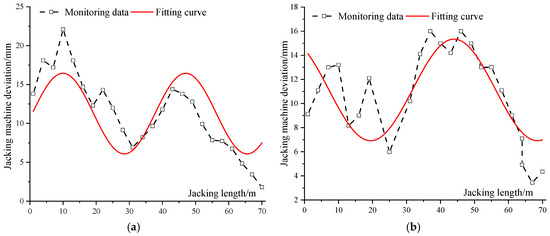 Monitoring data of the vertical axis deviation of the pipe-jacking machine: (a) The Hongzhuan Road 1# pipe jacking tunnel [25] and (b) the Hongzhuan Road 2# pipe jacking tunnel [25].