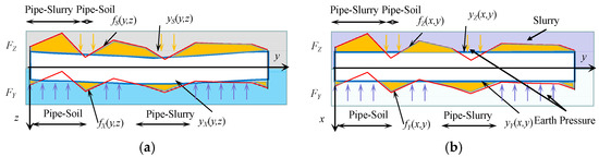 - When > , the upper side of the pipe is in pipe–slurry contact; when ≤ , the upper side of the pipe is in pipe–soil contact;