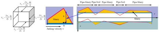 Under these assumptions, a differential element of the slurry body at any point G(x, y, z), with volume dxdydz, is subjected to body forces and surface forces during jacking. Due to the viscous nature of the mud slurry, both shear stresses and normal-direction shear stresses exist. The stress components vary across different directional planes of the element. To simplify the analysis, a simplified analytical model is adopted, as illustrated in Figure 5.