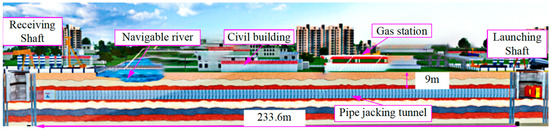The Suzhou Chengbei Road Utility Tunnel Project involves the construction of a main utility tunnel with a length of approximately 1365.08 m. The ground surface along the alignment contains critical structures such as rivers, gas stations, residential buildings, and the Qimen Overpass, as shown in Figure 6. Due to spatial constraints, the pipe jacking requires a single continuous thrust over a long distance of 233.6 m. The average overburden thickness in the jacking section is 9.1 m, with a cross-sectional dimension of 9.1 m (width) × 5.5 m (height).