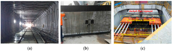 Pipe jacking construction site of Chengbei Road, Suzhou: (a) pipe segment grouting layout, (b) pipe segment waxing, and (c) pipe jacking.