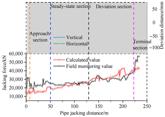 In the approach section, as the injected grout permeates through the soil, this condition deviates from assumption (2) of pipe–slurry contact. Therefore, a modified Newtonian friction law was applied, where the friction coefficient was determined through linear interpolation between the ungrouted coefficient (0.4) and the fully formed lubricant slurry sheath coefficient (0.08). During the stable and deviation sections, where complete lubricant slurry sheath formation was achieved, the jacking friction formula was implemented. The calculated jacking forces are shown in Figure 8.