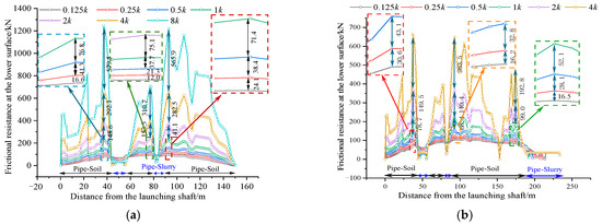 Figure 9 demonstrates that increasing the subgrade coefficient k not only elevates frictional resistance but also extends the pipe–slurry contact distance. As shown in Figure 9a, doubling the k value results in an approximate 78.6% increase in the peak frictional resistance within the pipe–soil contact segment. In the pipe–slurry interaction zone, the contact pattern transitions from pipe–soil to pipe–slurry contact with increasing k values. Figure 9b further reveals a gradual enhancement of frictional resistance in the pipe–slurry contact segment as k increases.