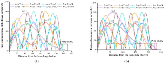 Based on the analysis of pipe jacking machine deviation in Figure 1, this study investigates the relationship between periodic parameters (amplitude and cycle) and underlying frictional resistance of rectangular pipe jacking under different jacking lengths. The computational conditions are defined with cutterhead deviation z0 = 0, amplitudes A = a and A = 2a (where a represents the overcut clearance of the pipe jacking machine), and cycle parameter m = 2π/l (with l denoting jacking length). Preset calculation cases with amplitudes a and 2a, combined with cycles ranging from T to T/4, reveal the periodic characteristics of frictional resistance, as demonstrated in Figure 10.