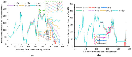 Friction resistance distribution under different pipe jacking machine deviations: (a) 150.23 m friction resistance distribution and (b) 233.6 m friction resistance distribution.
