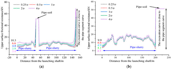 Upper surface friction resistance distribution under different slurry viscosity υ: (a) 150.23 m upper surface friction resistance and (b) 233.6 m upper surface friction resistance.