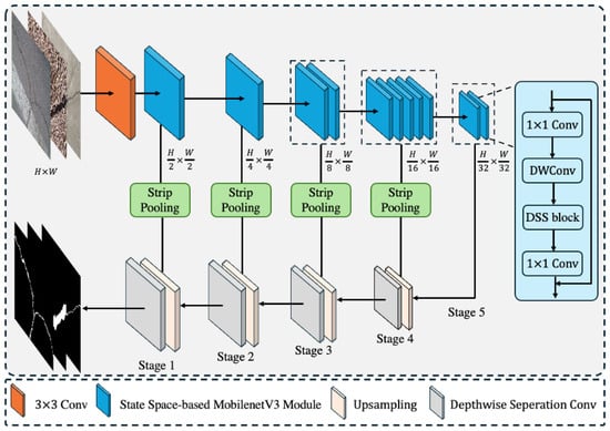 The proposed model adopts a U-shaped encoder–decoder architecture for efficient crack segmentation, as shown in Figure 1. The U-shaped encoder–decoder architecture was proposed by Ronneberger et al. [28]. Its main advantage is combining multi-scale features efficiently, which improves crack segmentation performance, especially for recovering fine-grained crack textures. For the encoder, we use MobileNetV3 [9] to extract features. The core of MobileNetV3 is the bottleneck module, which uses an inverted residual design combined with Squeeze-and-Excitation (SE) attention module [12] to encode features efficiently. However, the SE attention module highlights crack semantics by compressing channels, which cannot effectively solve the mismatch between local receptive fields of CNNs and complex crack global morphologies. Thus, we introduce the dynamic state space (DSS) block into the MobileNetV3 bottleneck module and propose the state space-based MobileNetV3 bottleneck module to extract hierarchical features. For the decoder, we primarily use upsampling operation and depthwise separable convolution to progressively restore and integrate features. Considering the complex background and uneven lighting in images captured by mobile devices, we embed the strip pooling module between the encoder and decoder to highlight cracks and suppress background-related noise. Additionally, we jointly use cross-entropy loss and boundary loss as the objective functions to optimize the classification of crack pixels and the accuracy of boundary pixels.