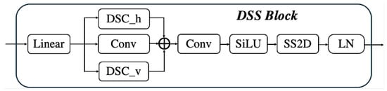 Due to the uncertainty in the shape and distribution of crack curves, we design a dynamic state space block to bridge the gap between state space models and 2D crack images, as shown in Figure 2. Inspired by [29], the DSS block consists of a linear layer for feature expansion, a set of dynamic snake convolutions (DSCs) [30] in both horizontal and vertical directions, a SiLU function for local representation enhancement, the SS2D module for modeling contextual relationships for 2D images with linear complexity, and the layer normalization for standardizing deep features.