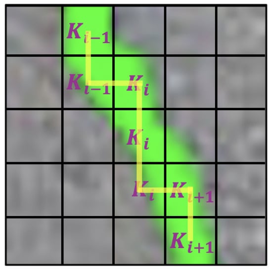where represents the layer normalization, ‘*’ is the cascaded operation, is the linear layer, and is the dynamic snake convolution. The dynamic snake convolution is a deformable convolution that is more suitable for cracks. We take the accumulation process of DSC in the x-axis as an example, as shown in Figure 3.