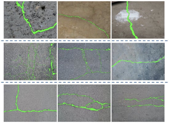 Crack500. The public Crack500 dataset [33] is collected using mobile phones on the main campus of Temple University, as shown in the second row of Figure 5. Each image and its corresponding annotated mask contain pavement cracks, with a resolution of approximately 2000 × 1500 pixels. In the original dataset, the training, validation, and testing sets are divided into 250, 50, and 200 images, respectively. To balance the high resolution of the images and limited computational resources, these high-resolution images are cropped into 16 non-overlapping sub-regions, and only slices containing more than 1000 crack pixels are retained. Based on this approach, the training, validation, and testing data consist of 1896, 348, and 1124 image patches, respectively.