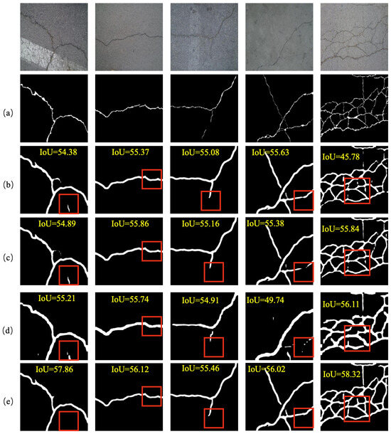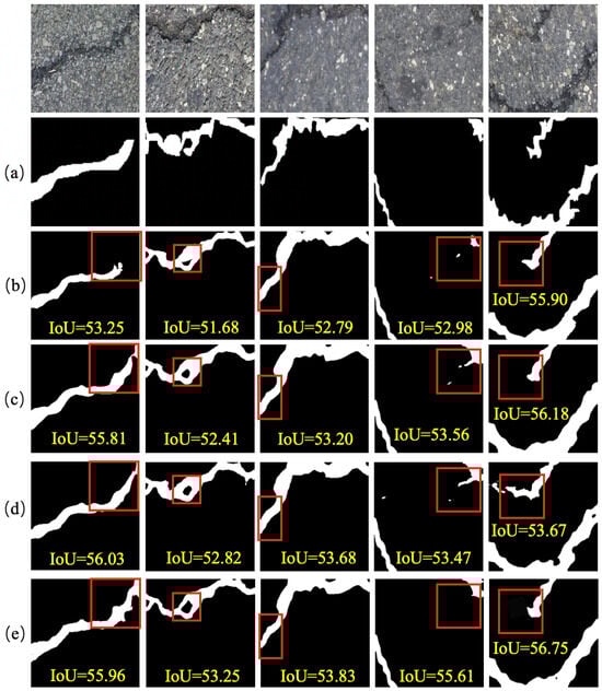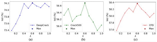 Moreover, we evaluated the hyperparameters which controlled the fusion of the cross-entropy loss and boundary loss across three public datasets, as shown in Figure 11. We found that when , the proposed method achieves the highest IoU scores on all three datasets. Furthermore, we also conducted corresponding ablation experiments on other hyperparameters, including the learning rate, architecture depth, and batch size. As shown in Table 7, we find that initializing with a smaller learning rate facilitates model convergence to the optimal solution. Furthermore, deepening the encoder architecture unexpectedly degrades segmentation accuracy, suggesting that excessive model depth may impair the decoder’s capacity to recover crack semantics. Notably, batch size adjustments demonstrate a negligible impact on overall model performance.