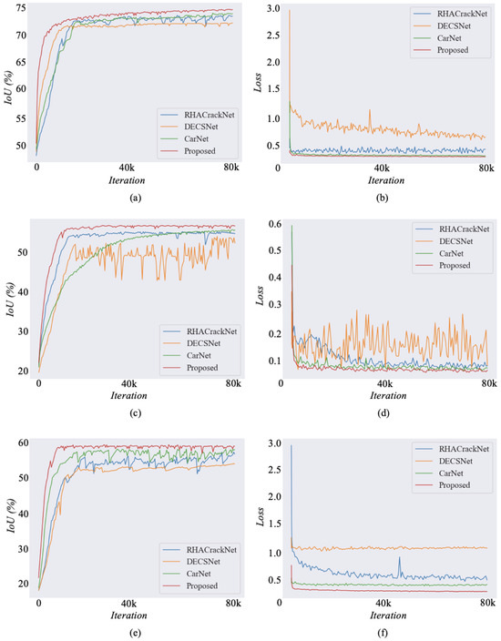 IoU and loss curves of three public datasets. (a,b) Corresponding curves of DeepCrack dataset. (c,d) Corresponding curves of Crack500 dataset. (e,f) Corresponding curves of CFD dataset.