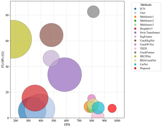 To evaluate the comprehensive performance of the model, we report the number of parameters, FLOPs and FPS values for all methods. As shown in Table 4, compared to general-purpose methods, the proposed model has significantly fewer parameters. Additionally, compared to real-time segmentation models, our proposed method has a lower FLOP value and faster FPS. To visually assess the efficiency of all models, we have visualized their performance in terms of parameter count, FLOPs and FPS. As shown in Figure 10, the proposed method is located in the bottom-right corner and has the smallest radius, indicating lower parameter count, fewer FLOPs, and faster FPS. Thus, our method is competitive in efficient crack segmentation tasks.