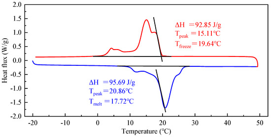 Due to its chemical inertness, good thermal storage density, small phase segregation, and relatively low price, paraffin wax is often used as a PCM in engineering [17,18,19]. However, paraffin wax has high fluidity when it is in liquid form during the phase-transition process. If no protective material is wrapped around its surface, leakage often occurs [20]. Microcapsule PCM is a micro-scale phase-change capsule made of paraffin as the core material and polymethyl methacrylate (PMMA) with good mechanical properties as the wall material. It not only effectively solves the leakage problem of paraffin during phase transition but also has high thermal cycling stability [21,22,23].