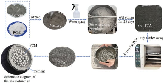 PCA is an aggregate particle made by encapsulating a certain amount of PCM with cement. The PCA prepared in this experiment has a microcapsule content of 20% of the total cement mass. The preparation process is shown in Figure 4.