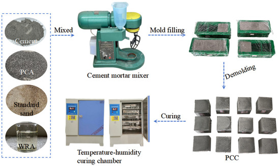 According to Table 2, PCA was used instead of standard sand to prepare PCC specimens. To control the testing cost and improve the testing efficiency, the specimens were made into cubes with a length, width, and height of 50 mm. The production method and process of the specimens are as shown in Figure 5. The method and process are as follows: Firstly, accurately weigh the materials required for the experiment, such as water, cement, standard sand, PCA, and water-reducing agent, and prepare them for later use. Next, place the cement, standard sand, and PCA in a drying dish and mix them thoroughly. Then, pour them into a cement mortar mixer and mix them in the order of “slow speed, fast speed, slow speed” to ensure thorough mixing. Then, add the water-reducing agent and water into the cement mortar mixer, and after mixing is complete, mold and compact them into shape. After 24 h of molding, remove the mold from the concrete and place it in a standard curing box (the temperature is 20 ± 0.5 °C, and the relative humidity is larger than 95%) for curing until a certain age, and then conduct corresponding tests.