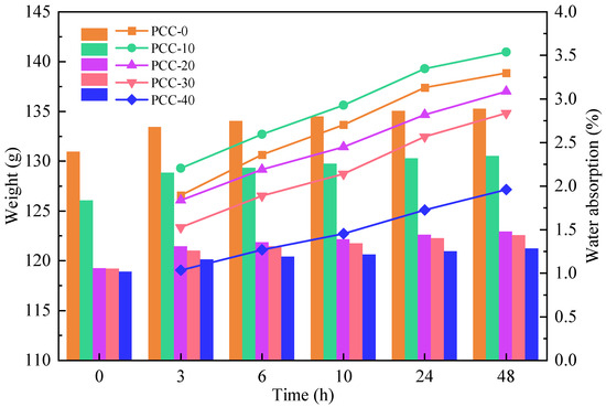 As illustrated in Figure 7, the water-absorption rate of PCC specimens is higher when the PCA content increases from 0% to 10%. The water-absorption rate of the specimens is generally lower when the PCA content increased from 10% to 40%. The water-absorption rate of the PCC specimen after 48 h is 3.54% when the PCA content is 10%, while the water-absorption rate of the specimen with 40% PCA content is only 1.96%. The addition of PCA particles increases the porosity of the specimen but simultaneously reduces the connected pores in the concrete, thereby decreasing the water-absorption rate [38]. In addition, PCMs are organic compounds with hydrophobicity. When these materials are encapsulated in aggregates, they may reduce the hydrophilicity of concrete [39]. Meanwhile, PCA adopts surface-encapsulation technology to form a dense shell, which blocks the connection between the internal pores of the aggregate and the outside world [40]. The performance of the specimen can enhance its durability and functional stability during use, offering it certain application advantages in the fields of building insulation and energy conservation in humid environments and freeze–thaw areas.