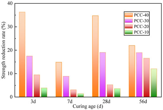 where represents the strength-loss rate of the specimen, %; represents the percentages of dosage, which are 10, 20, 30, and 40; and represents the compressive strength of schemes PCC-10, PCC-20, PCC-30, and PCC-40, respectively, MPa. The strength-loss rate of PCC specimens at different curing ages is shown in Figure 9.