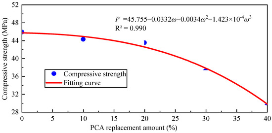 According to Figure 9, the compressive strengths of PCC-10, PCC-20, PCC-30, and PCC-40 at 28 days are 44.30 MPa, 43.53 MPa, 37.18 MPa, and 29.97 MPa, respectively, with corresponding strength-loss rates of 3.52%, 5.19%, 19.02%, and 34.73%, respectively. When the PCA content is low, the compressive strength of the specimen does not decrease significantly, but when the PCA content is larger than 20%, the compressive strength of the specimen significantly decreases. This is consistent with the research results found in references. The fitting curve between the compressive strength of the specimen at 28 days and the PCA replacement amount is shown in Figure 10.