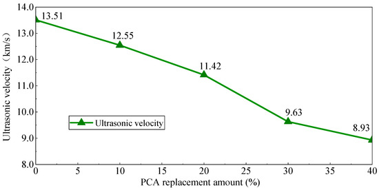 According to Figure 11, the ultrasonic velocities of PCC-0, PCC-10, PCC-20, PCC-30, and PCC-40 at 56 days of age were 13.51 km/s, 12.55 km/s, 11.42 km/s, 9.63 km/s, and 8.93 km/s, respectively. Among them, the ultrasonic velocities of PCC-10, PCC-20, PCC-30, and PCC-40 decreased by 7.13%, 15.49%, 28.74%, and 33.93%, respectively, compared to PCC-0. As the replacement amount of PCA increases, the density of PCC decreases, and the ultrasonic velocity of PCC significantly decreases, which is consistent with the results of apparent density analysis.