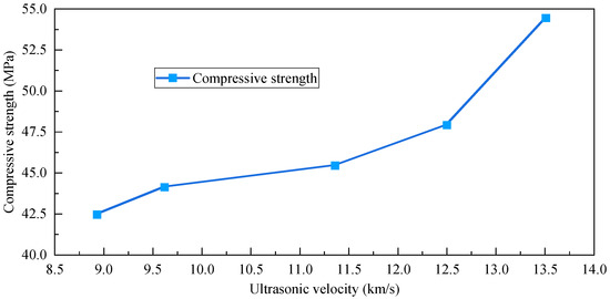 In the light of Figure 12, the compressive strength increases with the increase of ultrasonic velocity. The compressive strengths corresponding to ultrasonic velocities of 13.51 km/s, 12.55 km/s, 11.42 km/s, 9.63 km/s, and 8.93 km/s are 54.45 MPa, 47.91 MPa, 45.45 MPa, 44.13 MPa, and 42.46 MPa, respectively. As the replacement amount of PCA increases, the porosity inside the PCC specimen increases and the compactness decreases, resulting in a synchronous decrease in ultrasonic velocity and compressive strength.