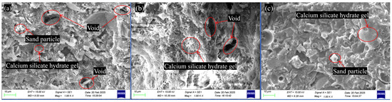 It can be seen from Figure 13a that the amount of calcium silicate hydrate (C-S-H) gel [42] is limited and distributed unevenly when the curing age is 3 days, the internal structure of PCC specimen is relatively loose, and there are many unfilled voids. At this time, the hydration reaction of cement has not yet been fully carried out, resulting in insufficient hydration products to fill the pore system and poor compactness of the microstructure. When curing to 7 days (Figure 13b), the number of internal voids of the specimens decreases, and the C-S-H gel in local areas increases significantly, forming a continuous network structure, and meanwhile, needle-like or sheet-like hydration products appear. The accumulation of hydration products effectively fills the pores, but there are still partially closed microcracks in some areas, resulting in poor uniformity of the microstructure of the specimen. After the curing age reaches 56 days (Figure 13c), the C-S-H forms a continuous and dense network structure, which greatly reduces the internal void ratio of the specimen and improves the bond strength between the aggregate and the cement matrix.