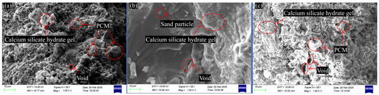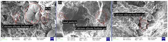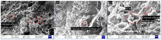According to Figure 14, the interface between PCM particles and the cement matrix is weak when the curing age is 3 days, and the amount of C-S-H is limited and distributed unevenly. Due to the incorporation of PCA occupying a portion of the cementitious material space, early hydration reactions are suppressed, resulting in high porosity and loose structure. This micro defect directly leads to a decrease in the compressive strength of the specimen with increasing PCA content [43]. With the advancement of the hydration process, C-S-H begins to deposit on the surface of PCA, filling pores and cracks, which leads to the improvement of the compressive strength of PCC specimens. After long-term curing, PCM particles are completely wrapped by a continuous C-S-H network, and the interface transition zone basically disappears. Combining Figure 15 and Figure 16, it can be seen that the structure of PCC-0 is relatively dense, with more C-S-H and Ca(OH)2. With increasing PCA content, more PCM is observed, and the cement-hydration products become loose. More pores appear between the cement-hydration products, which is also the main reason for the decrease in concrete strength. Due to the fact that the room temperature is around 22 °C and the melting point of paraffin wax is 17.72 °C, it is in a liquid state, and the electron microscope chamber is in a vacuum environment. The PCM surface has obvious wrinkles, but the wall surface is intact and well wrapped [44].