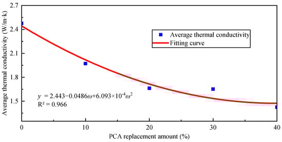 When the curing age is 56 days, the fitting curve of the relationship between the thermal conductivity and PCA replacement amount of PCC specimens with different PCA contents is shown in Figure 17.