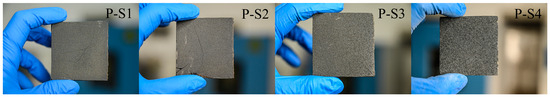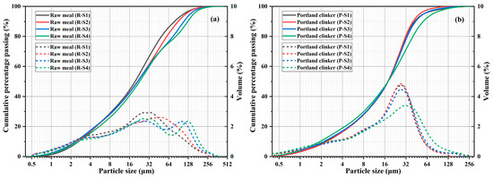 As illustrated in Figure 3a, the particle size distributions of raw meals match the trend observed in the sandstones. In this experiment, raw meals were initially pressed into blocks (60 mm × 60 mm × 5 mm). Subsequently, these blocks were calcined in a high-temperature furnace from room temperature to 900 °C (10 °C/min), with a holding time of half an hour at 900 °C. This was followed by continued calcination to 1450 °C, which was maintained for a further half an hour. After calcination, the blocks were removed from the high-temperature furnace and quickly cooled in air to obtain the Portland clinkers. The clinkers were then ground into powder, and their specific surface area was maintained within a tightly regulated range of 350 ± 10 m2/kg. The Portland clinkers prepared with S1 to S4 sandstones were named P-S1 to P-S4, respectively. Figure 3b shows the particle size distribution of clinkers.
