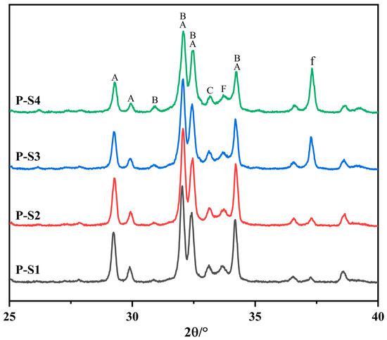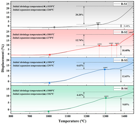 Figure 4 shows the thermomechanical curve of the raw meals. As depicted in Figure 4, all samples undergo obvious volume changes during calcination, which can be divided into three stages. The first stage is characterized by the low-temperature shrinkage, occurring from approximately 900 °C to 1270 °C. This is followed by a second stage of the medium-temperature, slight expansion from about 1270 °C to 1360 °C. The third stage is marked by the high-temperature shrinkage, from about 1360 °C to 1450 °C.