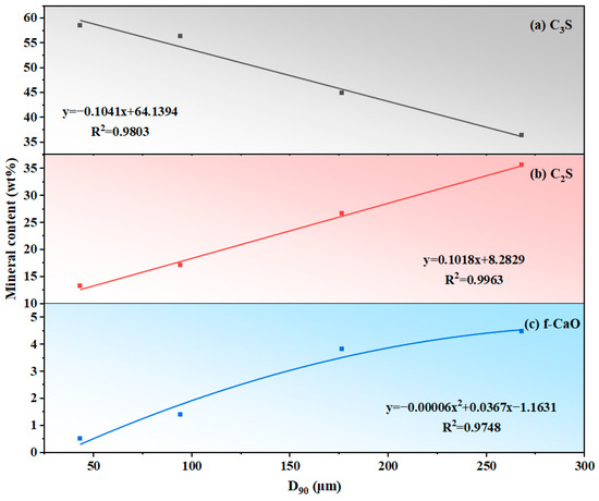 Figure 6 shows the XRD patterns of Portland clinkers. As shown in Figure 6, the main phases in these clinkers include C3S, C2S, C3A, C4AF, and f-CaO. The peak diffraction (2θ = 29.2°) intensity of C3S gradually decreases with the decrease in the fineness of sandstone, while the peak diffraction (2θ = 37.2°) intensity of f-CaO increases significantly. Table 7 shows the quantitative results of the clinkers by means of the external standard method. As sandstone fineness decreases, the content of C2S and f-CaO gradually increases, while the content of C3S and amorphous phase gradually decreases. Meanwhile, the content of C3A and C4AF remains relatively constant. The contents of C3S and C2S show a linear relationship with the fineness of sandstone (D90), while f-CaO exhibits a non-linear relationship with the fineness of sandstone. Their quantitative mathematical relationships and equations are shown in Figure 7. The increase in C2S content and decrease in C3S content in clinker will lead to an increase in grinding energy consumption and a reduction in early strength of cement. Additionally, excessive f-CaO content (>1.5%) may cause volumetric expansion after cement hardening, thereby affecting its soundness. It has been reported that the grain size of quartz in sandstone is directly proportional to the fineness of sandstone, and the content of f-CaO in clinker is negatively correlated with the grain size of quartz [12]. With an increase in quartz grain size, the contact surface between components decreases correspondingly, resulting in a decrease in the free energy of surface particles and ultimately slowing down the reaction rate [13]. Consequently, it can be concluded that the fineness of the sandstone exerts a substantial influence on the burnability of the raw meals, and that an enhancement in sandstone fineness is conducive to the conversion of C2S to C3S.